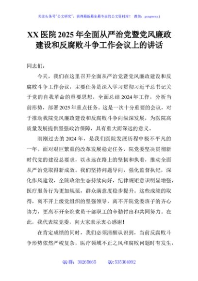 / XX医院2025年全面从严治党暨党风廉政建设和反腐败斗争工作会议上的讲话
