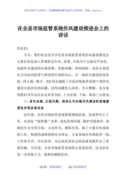 / 在全县市场监管系统作风建设推进会上的讲话