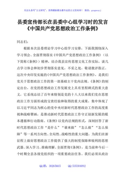 / 县委宣传部长在县委中心组学习时的发言《中国共产党思想政治工作条例》