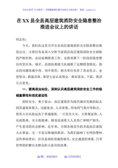 / 在XX县全县高层建筑消防安全隐患整治推进会议上的讲话