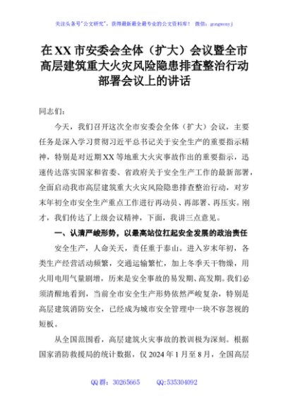 / 在XX市安委会全体(扩大)会议暨全市高层建筑重大火灾风险隐患排查整治行动部署会议上的讲话