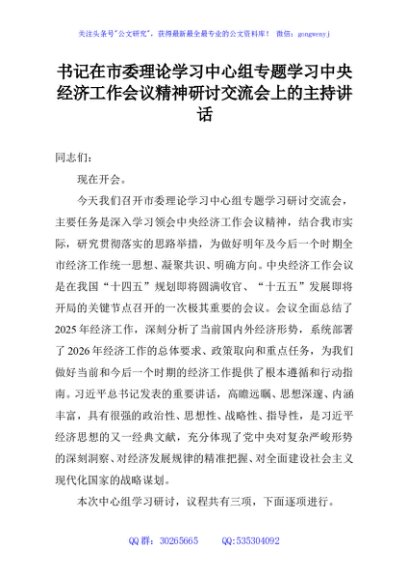 / 书记在市委理论学习中心组专题学习中央经济工作会议精神研讨交流会上的主持讲话