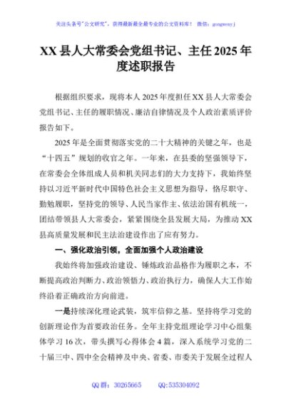 / XX县人大常委会党组书记、主任2025年度述职报告