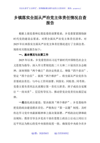 / 乡镇落实全面从严治党主体责任情况自查报告