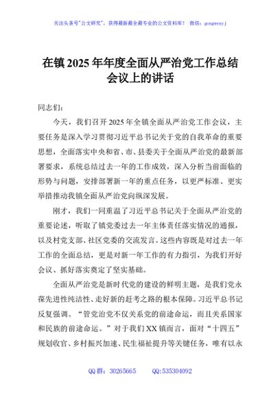 / 在镇2025年年度全面从严治党工作总结会议上的讲话