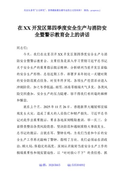/ 在XX开发区第四季度安全生产与消防安全暨警示教育会上的讲话