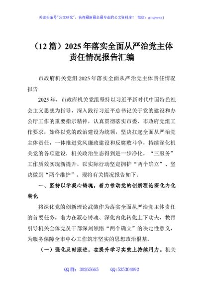 / (12篇)2025年落实全面从严治党主体责任情况报告汇编