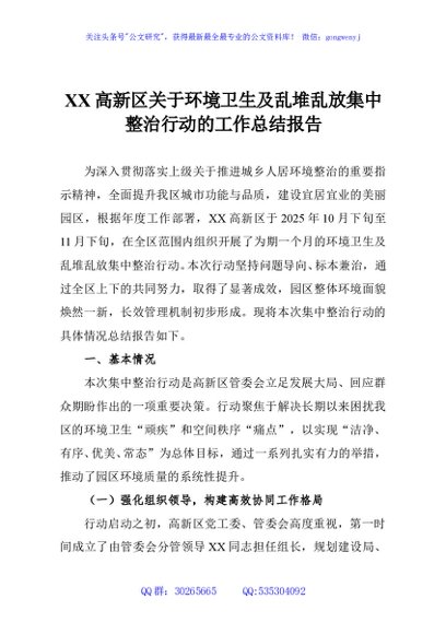 / XX高新区关于环境卫生及乱堆乱放集中整治行动的工作总结报告