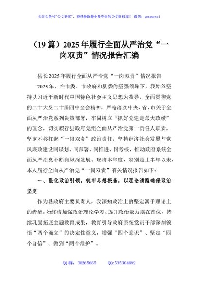 / (19篇)2025年履行全面从严治党“一岗双责”情况报告汇编