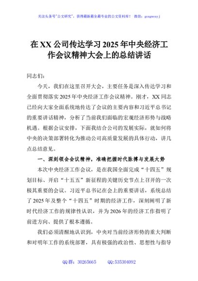 / 在XX公司传达学习2025年中央经济工作会议精神大会上的总结讲话