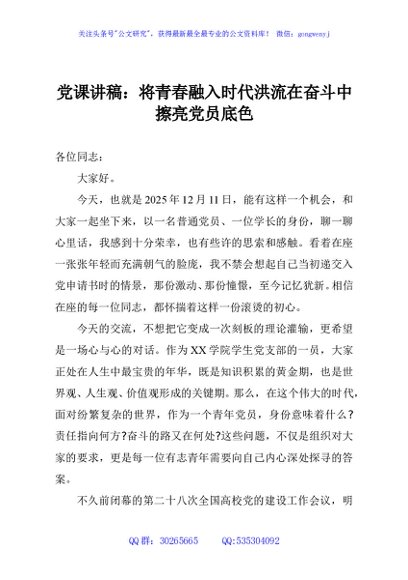 / 党课讲稿:将青春融入时代洪流在奋斗中擦亮党员底色