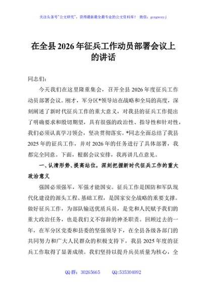 / 在全县2026年征兵工作动员部署会议上的讲话