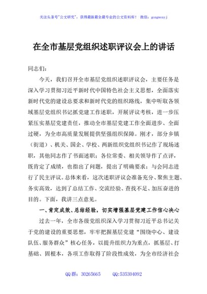 / 在全市基层党组织述职评议会上的讲话