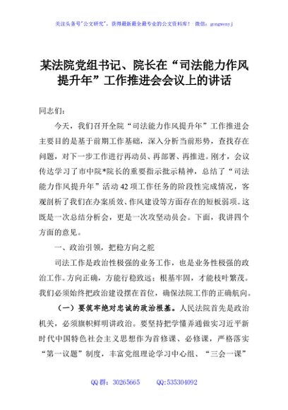 / 某法院党组书记、院长在“司法能力作风提升年”工作推进会会议上的讲话