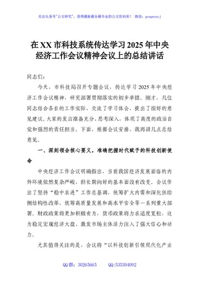 / 在XX市科技系统传达学习2025年中央经济工作会议精神会议上的总结讲话