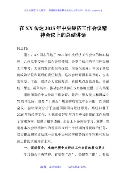/ 在XX传达2025年中央经济工作会议精神会议上的总结讲话