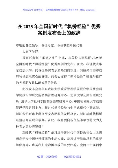 / 在2025年全国新时代“枫桥经验”优秀案例发布会上的致辞
