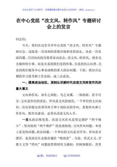 / 在中心党组“改文风、转作风”专题研讨会上的发言