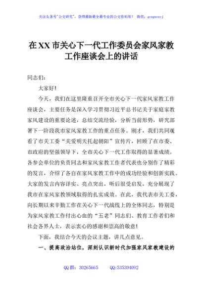 / 在XX市关心下一代工作委员会家风家教工作座谈会上的讲话