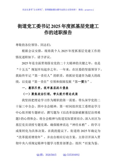 / 街道党工委书记2025年度抓基层党建工作的述职报告