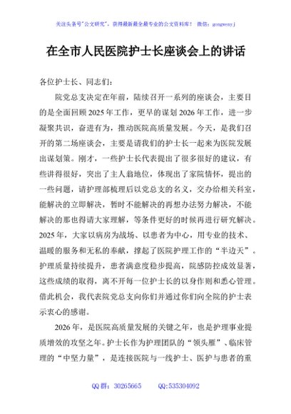 / 在全市人民医院护士长座谈会上的讲话