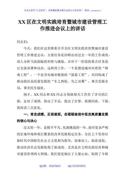 / XX区在文明实践培育暨城市建设管理工作推进会议上的讲话