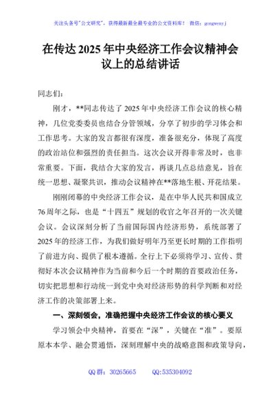 / 在传达2025年中央经济工作会议精神会议上的总结讲话