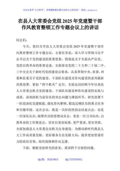 / 在县人大常委会党组2025年党建暨干部作风教育整顿工作专题会议上的讲话