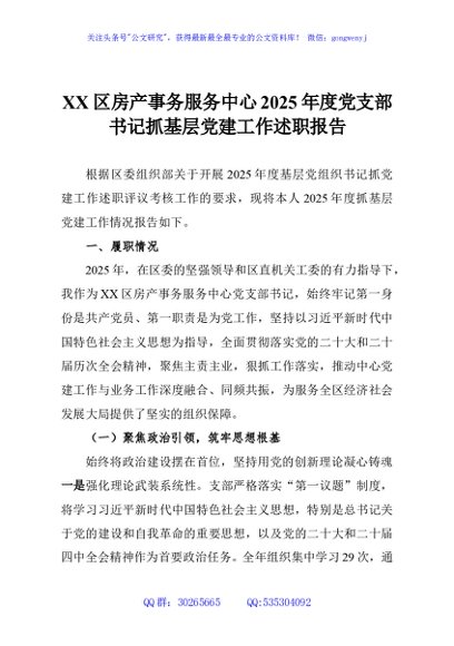 / XX区房产事务服务中心2025年度党支部书记抓基层党建工作述职报告