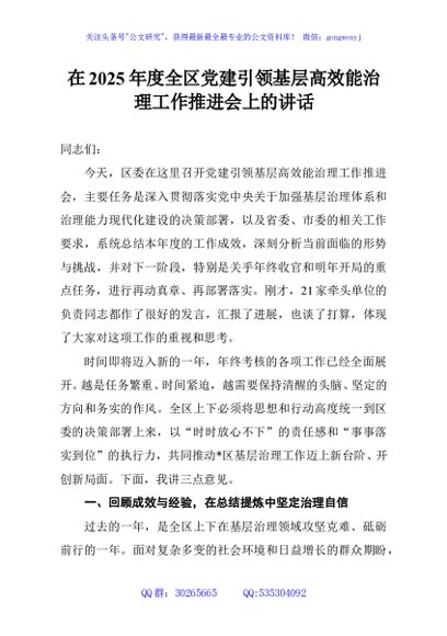 / 在2025年度全区党建引领基层高效能治理工作推进会上的讲话