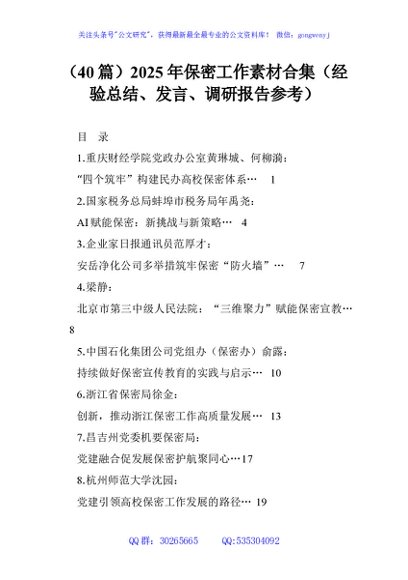 / (40篇)2025年保密工作素材合集(经验总结、发言、调研报告参考)