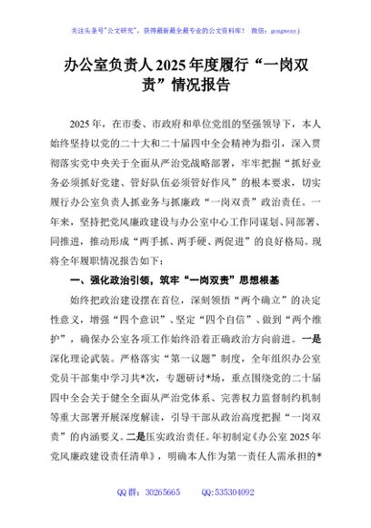/ 办公室负责人2025年度履行“一岗双责”情况报告