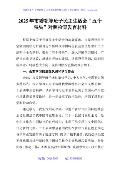 / 2025年市委领导班子民主生活会“五个带头”对照检查发言材料