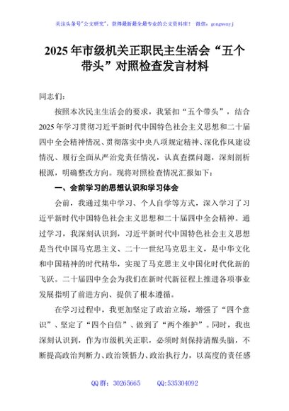 / 2025年市级机关正职民主生活会“五个带头”对照检查发言材料