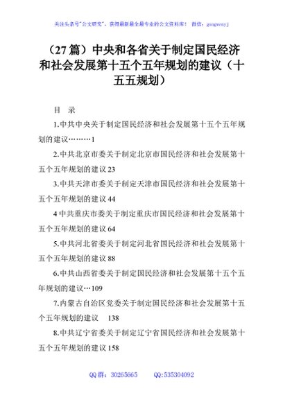 / (27篇)中央和各省关于制定国民经济和社会发展第十五个五年规划的建议(十五五规划)