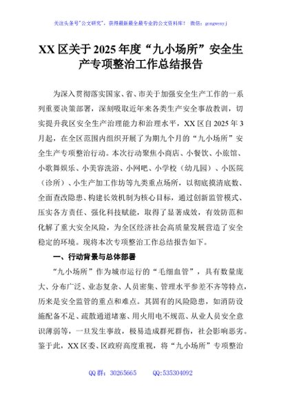 / XX区关于2025年度“九小场所”安全生产专项整治工作总结报告