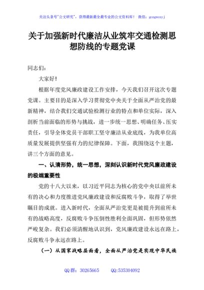 / 关于加强新时代廉洁从业筑牢交通检测思想防线的专题党课