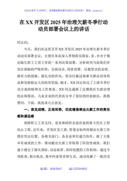 / 在XX开发区2025年治理欠薪冬季行动动员部署会议上的讲话