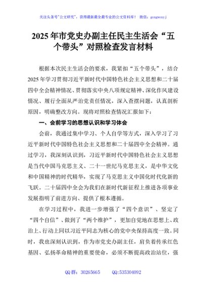 / 2025年市党史办副主任民主生活会“五个带头”对照检查发言材料