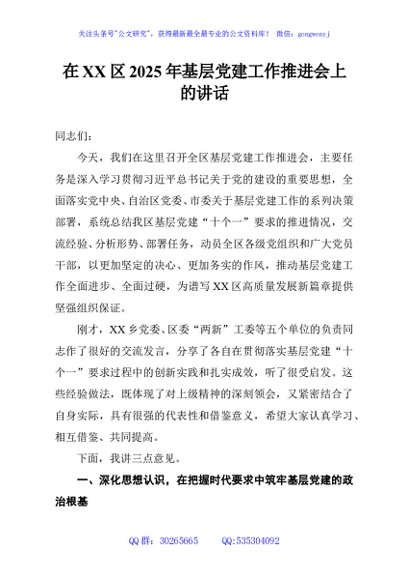 / 在XX区2025年基层党建工作推进会上的讲话