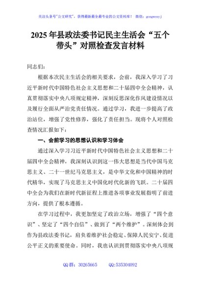 / 2025年县政法委书记民主生活会“五个带头”对照检查发言材料