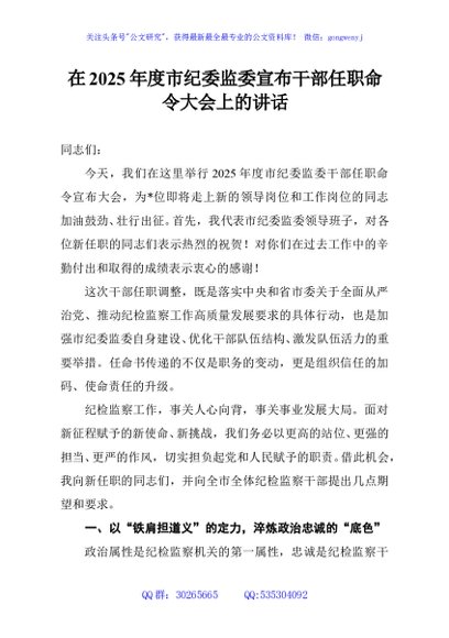 / 在2025年度市纪委监委宣布干部任职命令大会上的讲话