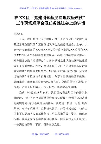 / 在XX区“党建引领基层治理攻坚硬仗”工作现场观摩会及任务推进会上的讲话