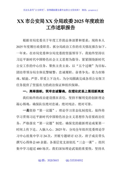 / XX市公安局XX分局政委2025年度政治工作述职报告
