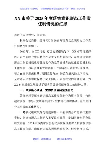 / XX市关于2025年度落实意识形态工作责任制情况的汇报
