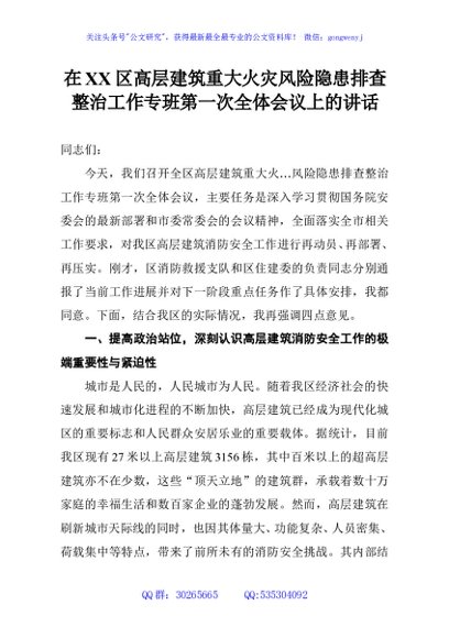 / 在XX区高层建筑重大火灾风险隐患排查整治工作专班第一次全体会议上的讲话