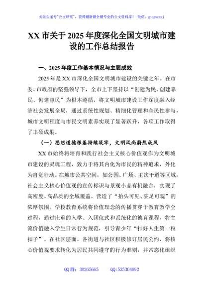 / XX市关于2025年度深化全国文明城市建设的工作总结报告