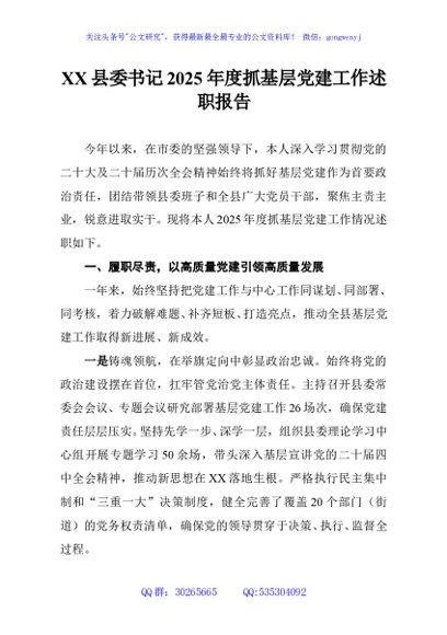 / XX县委书记2025年度抓基层党建工作述职报告