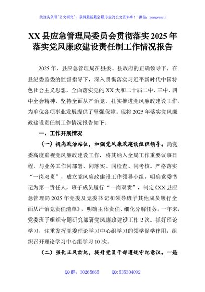 / XX县应急管理局委员会贯彻落实2025年落实党风廉政建设责任制工作情况报告