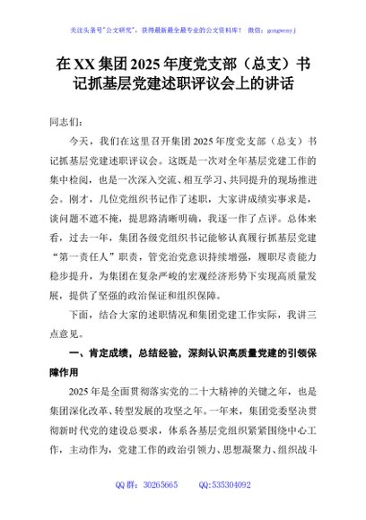 / 在XX集团2025年度党支部(总支)书记抓基层党建述职评议会上的讲话